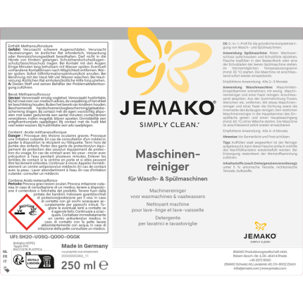 - Anwendung Waschmaschine: Waschmittel-Einspülkammer entnehmen, mit wenig Maschinenreiniger und einer JEMAKO Faser reinigen. Anschliessend abspülen. Aus der Gummidichtung Flusen, Steinchen etc. entfernen. Mit etwas Maschinenreiniger die Dichtung sowie die Innenseite des Bullauges reinigen. Den restlichen Maschinenreiniger in die Hauptkammer des Einspülfachs geben und einen Hauptwaschgang bei mindestens 60 °C ohne Wäsche starten. Nach der Anwendung ist die Maschine sofort wieder einsatzbereit. Empfohlene Anwendung: Alle 4 – 6 Monate.
