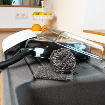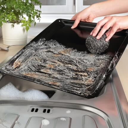 Starke Verkrustungen und Fett-Rückstände mit der Edelstahlspirale oder dem grauen DuoPad lösen, anschließend mit viel Wasser abnehmen. DuoPad und Profi-Edelstahlspirale nach der Anwendung gründlich auswaschen.