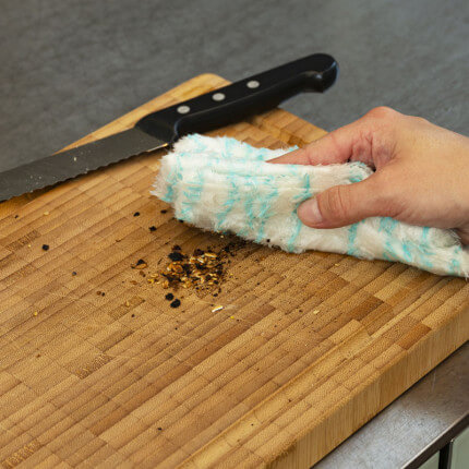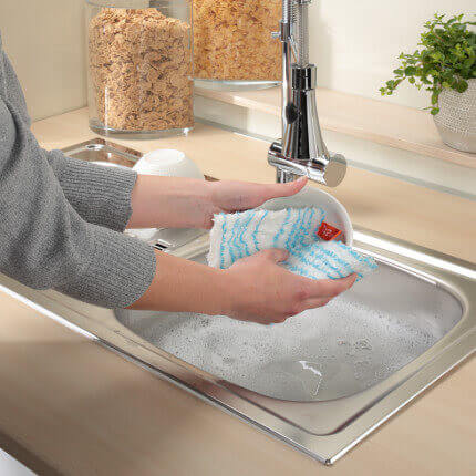 L’aiutante perfetto per la pulizia delle stoviglie. Il Panno per stoviglie raccoglie lo sporco e le briciole senza fatica. Contemporaneamente è facilissimo da strizzare e lavare. Un vero «mostro antibriciole» in cucina.