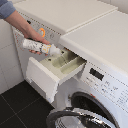 - Impiego in lavastoviglie: svitare il tappo rosso e rimuovere la pellicola di protezione. Inserire la bottiglia a testa in giù nel cestello delle posate o in uno scomparto vuoto dalla lavastoviglie vuota. Quindi eseguire un lavaggio a temperatura possibilmente alta (min. 55 °C). La macchina è utilizzabile subito dopo l’uso. Uso consigliato: ogni 2 – 3 mesi.