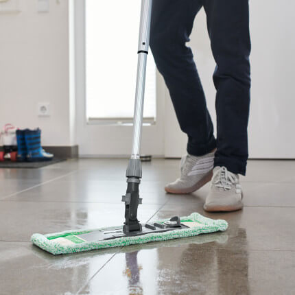 Verser l'entretien des sols dans l'eau de lavage (rapport de dosage : 1:500 ; par ex. 10 ml de produit d'entretien pour sols (1 bouchon) dans 5 l d'eau) et nettoyer brièvement le sol avec la fibre pour sol verte à fibres courtes en l'humidifiant. Essuyer ensuite avec la fibre pour sol blanche et absorber l'eau restante, y compris les salissures résiduelles.