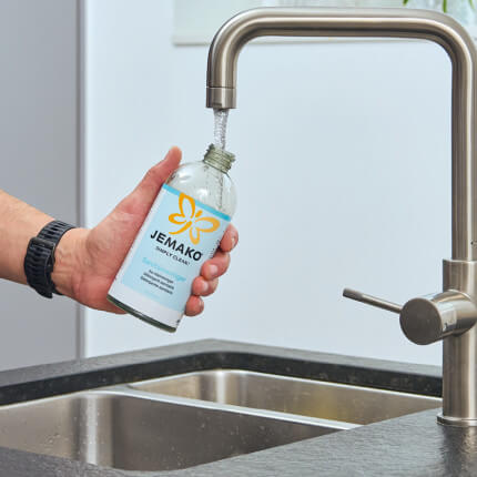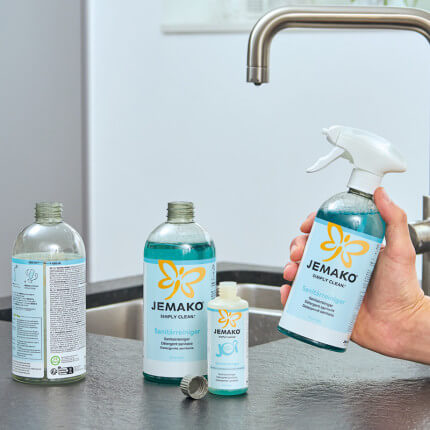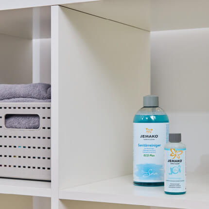 - Bei normaler Verschmutzung: Einige Spritzer Sanitärreiniger in das Putzwasser geben.
