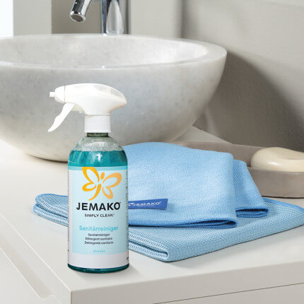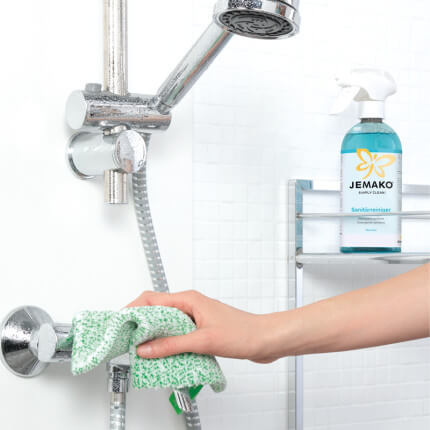 - Bei starker Verschmutzung: Sanitärreiniger unverdünnt auf das feuchte Profituch geben und Oberflächen sowie Armaturen reinigen. Anschliessend gründlich nachspülen oder mit einem feuchten Profituch nachreinigen.