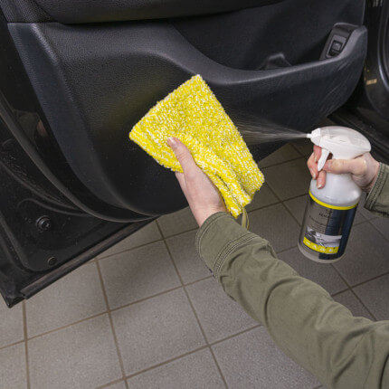 Fahrzeuginnenreiniger sparsam auf das trockene Fahrzeuginnentuch sprühen und die verschmutzen Oberflächen, wie z. B. Armaturenbrett, Mittelkonsole, Türgriffe etc. mit sanftem Druck reinigen.