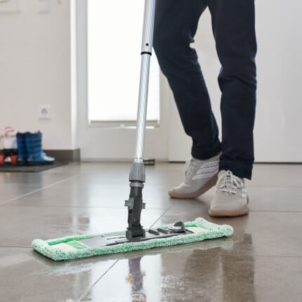 Vloeronderhoud in het dweilwater gieten (doseringsverhouding: 1:500; bijvoorbeeld 10 ml Vloeronderhoud (1 dop) in 5 l water) en de vloer met de bijpassende Vloervezel vochtig afnemen. Daarna met de witte Vloervezel nadweilen en het achtergebleven water incl. losgeweekt vuil opnemen.
