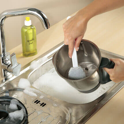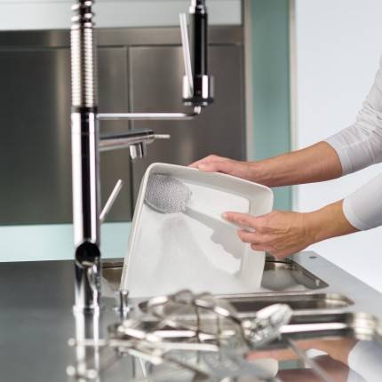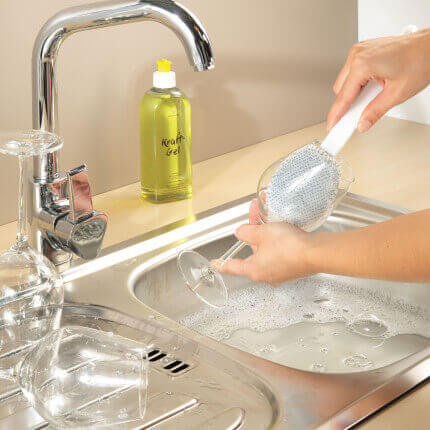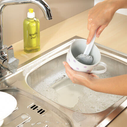 Beim Spülen/Abspülen verwenden und weisse/graue Faser je nach Art der zu spülenden Teile einsetzen. Spülköpfe regelmässig austauschen und waschen.