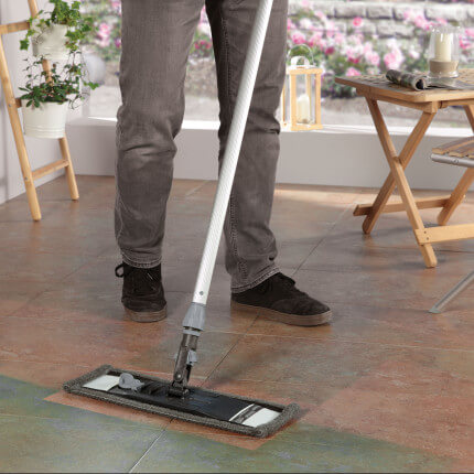 Voeg vloeronderhoud toe aan het dweilwater (doseerverhouding: 1:500; bijv. 10 ml Vloeronderhoud (1 dopje) in 5 liter water) en maak de vloer kort vochtig schoon met de groene vloervezel. Veeg vervolgens met de witte vloervezel en neem het resterende water en vuil op.