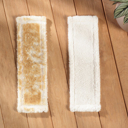 Bodenpflege ins Wischwasser geben (Dosierungsverhältnis: 1:500; z. B. 10 ml Bodenpflege (1 Verschlusskappe) in 5 l Wasser) und den Boden mit der Bodenfaser grün lang feucht reinigen. Anschliessend mit der weissen Bodenfaser nachwischen und das verbliebende Wasser inkl. Restschmutz aufnehmen.