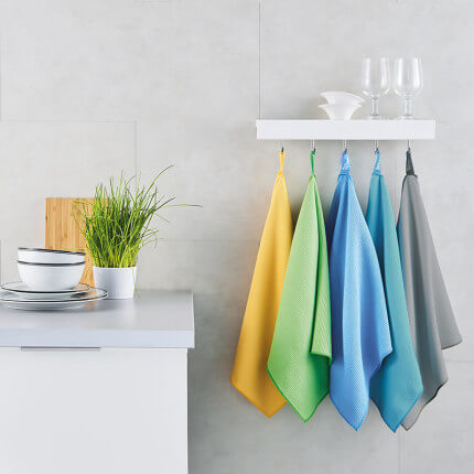 - Das Geschirrtuch ist in fünf Farben (Gelb, Grün, Blau, Türkis, Grau) und der Grösse 45 x 80 cm erhältlich