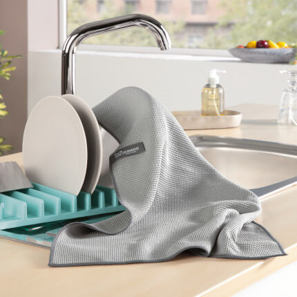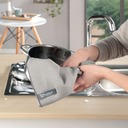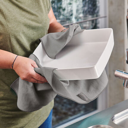 Einfach trocken einsetzen, um unempfindliche Oberflächen und Gegenstände nachzutrocknen. Das Geschirrtuch ist perfekt für grössere Gegenstände wie z. B. Gläser, Pfannen, Töpfe etc. geeignet.