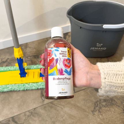 Bodenpflege ins Wischwasser geben (Dosierungsverhältnis: 1:500; z. B. 10 ml Bodenpflege (1 Verschlusskappe) in 5 l Wasser) und den Boden mit der entsprechenden Bodenfaser feucht reinigen. Anschliessend mit der weissen Bodenfaser nachwischen und das verbliebende Wasser inkl. Restschmutz aufnehmen.