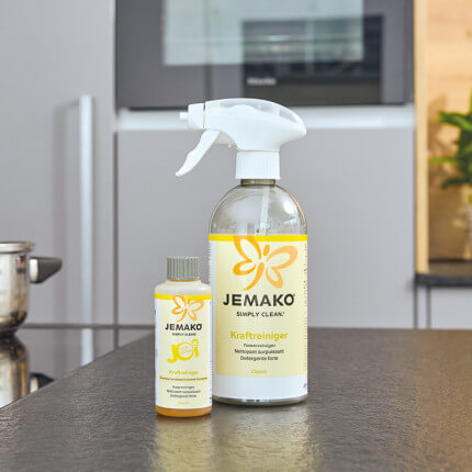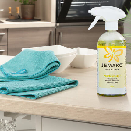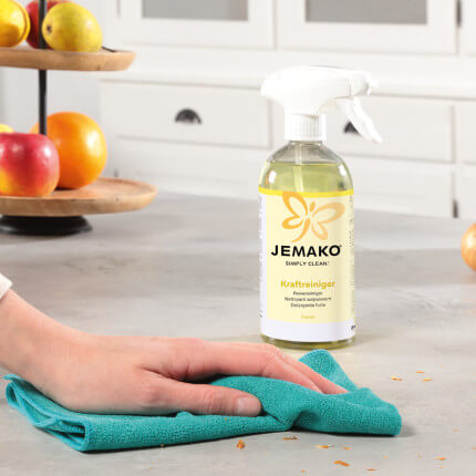 - Vaporiser le nettoyant surpuissant sur un chiffon pro, un chiffon pour vaisselle ou une fibre verte JEMAKO et nettoyer la surface souhaitée. Rincer ou essuyer avec un chiffon humide, et le tour est joué !