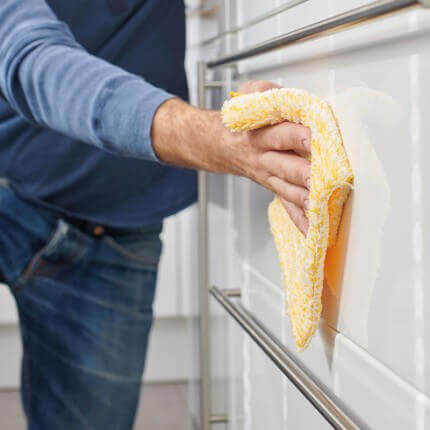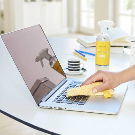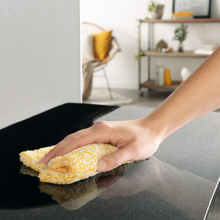 Utilisez le chiffon Duo à sec pour dépoussiérer. Utilisé légèrement humide, il est idéal pour nettoyer les surfaces délicates (par ex. les surfaces brillantes). Légèrement humidifié, le chiffon pro est idéal pour nettoyer toutes les surfaces non délicates. Pour des surfaces en verre et des miroirs étincelants sans laisser de traces, vaporisez un peu de nettoyant pour le verre sur un chiffon pro propre et sec et nettoyez les surfaces. Inutile de rincer.
