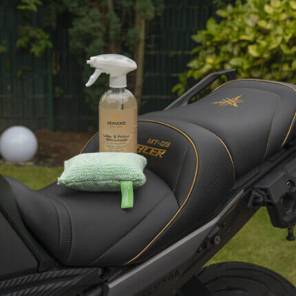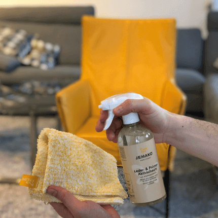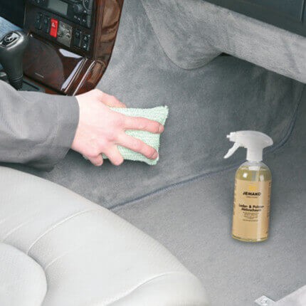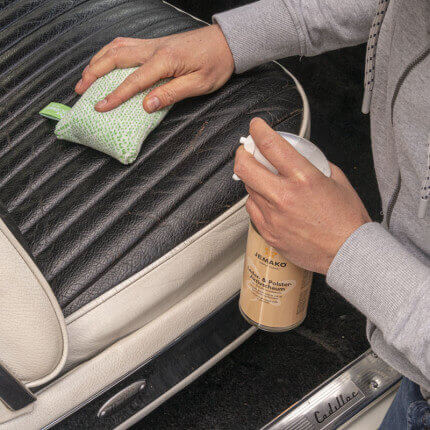 Si nécessaire, débarrassez la surface capitonnée à nettoyer de ses peluches ou poils d’animaux avec le DuoPad bleu. Vaporisez ensuite la mousse active spécial cuir et garnitures capitonnées sur l’éponge humide puis nettoyez en effectuant des mouvements circulaires. Pour finir, essuyez avec le chiffon pro humide puis laissez sécher.
