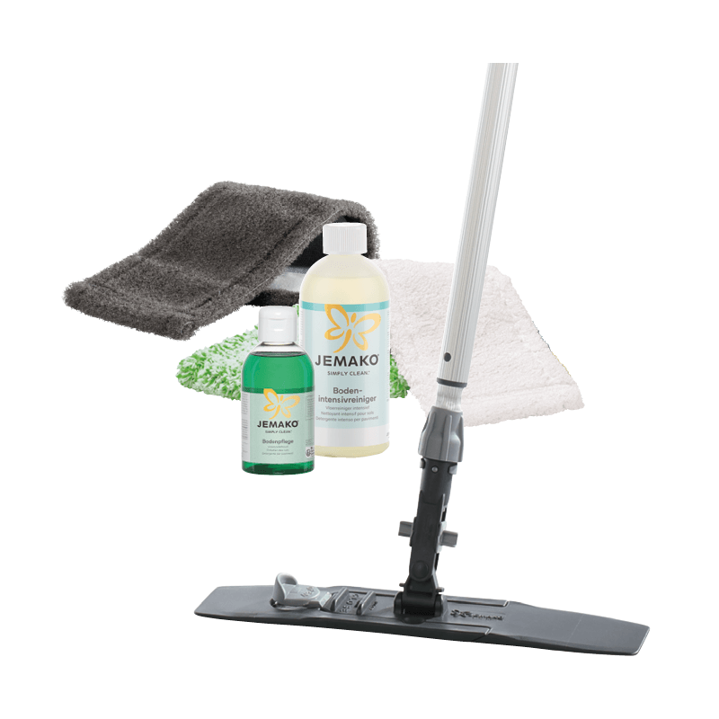 La combinaison parfaite d’un support sol, de trois fibres pour sol et de deux nettoyants pour sols lisses et non délicats et surfaces robustes en extérieur.