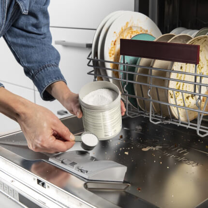In caso di sporco da normale a ostinato, versare 18 g di Polvere (dosatore completamente riempito a raso) nello scomparto della lavastoviglie. In caso di sporco leggero (o carico incompleto della lavastoviglie), versare 9 g di Polvere (marcatura esterna sul dosatore). Se necessario, rabboccare il sale della lavastoviglie e, se necessario, utilizzare il brillantante. Chiudere con accuratezza il barattolo per non fare volatizzare la Polvere e per proteggere il contenuto dall’umidità.